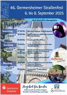 Vom 6. bis zum 8. September 2025 findet zum 46. Mal das Germersheimer Straßenfest auf dem Kirchenplatz vor der katholischen Kirche St. Jakobus statt.Abwechslungsreiche Festtage stehen den Germersheimern und ihren Gästen aus nah und fern am ersten langen Septemberwochenende bevor. Die Stadt Germersheim lädt alle Feierlustigen wieder zusammen mit den teilnehmenden Vereinen, Institutionen und Organisationen zu geselligen Stunden auf das beliebte Straßenfest ein. Vor der ehemaligen Klosterkirche Sankt Jakobus, rund um den gleichnamigen Pilgerbrunnen, bewirten rund 20 Bewirtschaftungsstände die Straßenfestbesucher mit allerlei kulinarischen Köstlichkeiten. Um weitgehende Unabhängigkeit vom Wetter zu gewährleisten, beherrscht die Mitte des Platzes ein großes Festzelt mit einer zentralen Musikbühne.