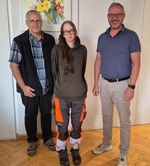 Herzlich begrüßten Germersheims Bürgermeister Marcus Schaile (rechts im Bild) und Betriebshofleiter Peter Weng am Montag, den 2. September 2024 Leann Pfeifer als neue Auszubildende bei der Stadt Germersheim und wünschten ihr für die kommende wichtige Lebens- und Arbeitsphase viel Freude und Erfolg.