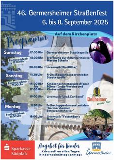 Vom 06. bis zum 08. September 2025 findet zum 46. Mal das Germersheimer Straßenfest auf dem Kirchenplatz vor der katholischen Kirche St. Jakobus statt.Abwechslungsreiche Festtage stehen den Germersheimern und ihren Gästen aus nah und fern am ersten langen Septemberwochenende bevor. Die Stadt Germersheim lädt alle Feierlustigen wieder zusammen mit den teilnehmenden Vereinen, Institutionen und Organisationen zu geselligen Stunden auf das beliebte Straßenfest ein. Vor der ehemaligen Klosterkirche Sankt Jakobus, rund um den gleichnamigen Pilgerbrunnen, bewirten rund 20 Bewirtschaftungsstände die Straßenfestbesucher mit allerlei kulinarischen Köstlichkeiten. Um weitgehende Unabhängigkeit vom Wetter zu gewährleisten, beherrscht die Mitte des Platzes ein großes Festzelt mit einer zentralen Musikbühne.