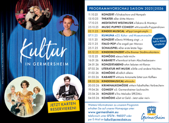 mit großer Freude präsentieren wir Ihnen unser neues Kulturprogramm für die Saison 2025/2026! Freuen Sie sich auf mitreißende Inszenierungen, bewegende Dramen und unvergessliche Theaterabende, Konzerte oder Kabarettvorstellungen, die inspirieren und verbinden.