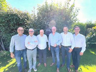Dieter Hänlein empfing bei strahlendem Sonnenschein seine Gäste. (v.l.n.r.) Landrat Dr. Fritz Brechtel, Altbürgermeister Benno Heiter, Jubilar und Altbürgermeister Dieter Hänlein, Erster Beigeordneter Dr. Sascha Hofmann und Erster Kreisbeigeordneter Christoph Buttweiler.