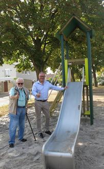 Daumen hoch für kindgerechte Spielgeräte: Germersheims Bürgermeister Marcus Schaile und der Sondernheimer Ortsvorsteher Friedrich Rentschler begrüßen die neue Rutsche in kinderfreundlichem Design auf dem Schwester-Quentina-Platz in Sondernheim. Foto: SNelles | Stadt Germersheim
