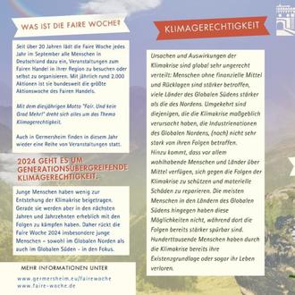 Die Faire Woche 2024 steht vor der Tür und lädt auch in Germersheim alle Bürgerinnen und Bürger herzlich dazu ein, an einer Vielzahl spannender und inspirierender Veranstaltungen teilzunehmen. Unter dem Motto „Generationenübergreifende Klimagerechtigkeit“ hat die Stadt ein abwechslungsreiches Programm auf die Beine gestellt, das für jedes Alter etwas bietet und das Bewusstsein für Fairness, Nachhaltigkeit und Umweltverantwortung schärfen soll.
