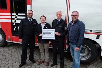 Craig McMain, Werkleiter der Fa. Ardagh Group aus Germersheim, hatte in der vergangenen Woche gleich zwei symbolische Spendenschecks im Gepäck, als er sich mit Bürgermeister Marcus Schaile, Wehrleiter Andreas Magin und Günter Trauth, dem Vorsitzenden des Fördervereins der Feuerwehr Germersheim, am Feuerwehrhaus in der Sondernheimer Straße traf.