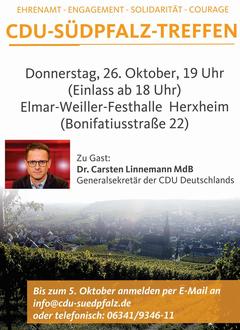 Der CDU Stadtverband Germersheim-Sondernheim lädt herzlich ein zum traditionellen CDU-Südpfalztreffen am Donnerstag, 26. Oktober um 19 Uhr (Einlass ab 18 Uhr) in der Elmar-Weiller-Festhalle in Herxheim (Bonifatiusstraße 22).