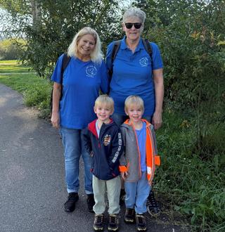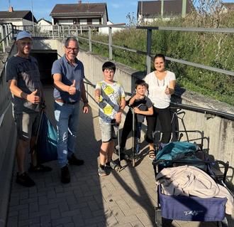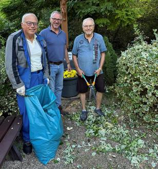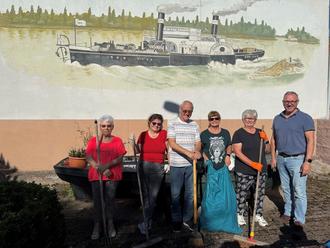 Germersheims Bürgermeister Marcus Schaile (rechts im Bild), hier mit Peter Meyer (vorne links) und seinem Sohn Martin, begleitete den Umwelt- und Freiwilligentag in Germersheim und Sondernheim, packte auch selbst mit an und dankte den vielen Helferinnen und Helfern herzlich für ihren großartigen Einsatz. Fotos: SNelles und FOhmer I Stadt Germersheim sowie privat.