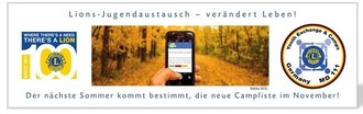Lions International bietet im kommenden Sommer interessierten Jugendlichen wieder die Möglichkeit an einem Jugendaustausch teilzunehmen. Hierbei sollen andere Kulturen erlebt und durch Reisen ins Ausland ein neues, erweitertes Verständnis von der Welt gewonnen werden, um gegenseitigen Respekt und Verständnis zu fördern. Die Teilnehmenden sind dabei aufgefordert, diese Gelegenheit zu nutzen, auch Anderen ihre eigene Kultur nahe zu bringen und damit zu Botschaftern für Frieden und Völkerverständigung zu werden.