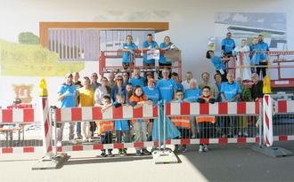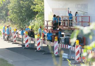 Städtepartnerschaft im Ein- bzw. Gleichklang: Germersheims Bürgermeister Marcus Schaile und sein Amtskollege Jószef Baracskai arbeiten, tatkräftig unterstützt von zwei ungarischen Gästen, am Wappen von Zalaszentgrót, das nun die Unterführung, die an der neuen Feuerwehr, der Tierklinik und der Südpfalz - Kaserne liegt schmückt.