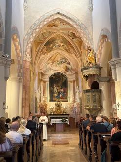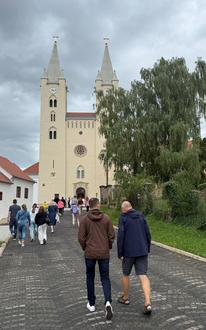 Am Donnerstagvormittag besuchten Deutsche und Ungarn das Prämonstratenserkloster im von der ungarischen Partnerstadt Zalaszentgrót nur sechs Kilometer entfernten Türje. Pater Paul, momentan einziger Ordensvertreter vor Ort, erläuterte stolz die Klostergeschichte sowie die Hintergründe seines Ordens. Die Mitglieder des Prämonstratenserordens, gegründet im Jahr 1120 von Norbert von Xanten, leben nach der Regel des Heiligen Augustinus. Die Grundlage ihrer Gemeinschaft basiert nicht nur auf einem Leben in Bescheidenheit, Enthaltsamkeit und Gehorsam, sondern auch auf aktiver, engagierter Seelsorge. Die im Kern spätromanische Klosterkirche Mariae Verkündigung wurde um 1230 von einem französischen Meister geschaffen und steht mit den sich ihr anschließenden Klostergebäuden, von denen eines momentan renoviert und in ein modernes Besucherzentrum umgebaut wird, auf einer kleinen Anhöhe in Türje.