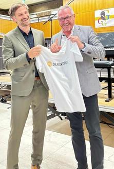 Bei der offiziellen Amtseinführung von StD Martin Stein überreichte Bürgermeister Marcus Schaile dem neuen Schulleiter des GGG, der den geplanten Schüleraustausch ebenfalls unterstützt, ein T-Shirt aus der ungarischen Partnerstadt.