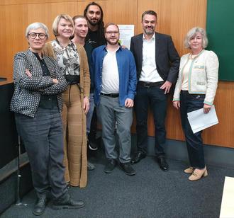 v.l.n.r.: Prodekanin Prof. Renata Makarska, Dekanin Prof. Silvia Hansen-Schirra, Mike Carla (AStA), Arman Yekta Akgül (AStA), Arnim Bogatzki (AStA), Erster Beigeordnte Dr. Sascha Hofmann und Geschäftsführerin Dr. Eva-Kathrin Müller.