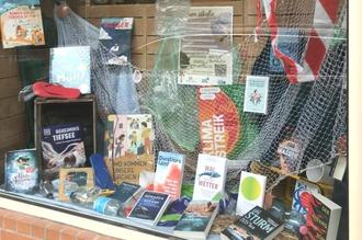 Faire Schaufenster in der Innenstadt, von der Universitätsbuchhandlung B.Laue und der Unibuchhandlung Hilbert.