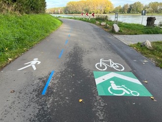 Die neuen Bodenmarkierungen auf dem 3,5 km langen barrierefreien Abschnitts des Rhein-Radweges, ausgehend vom Rheinvorland an der Steigeranlage entlang des Rheins bis hin zur Alten Ziegelei in Sondernheim sowie in umgekehrter Richtung, wurden immer dort platziert, wo ein Weg abzweigt.