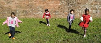 Vor Ort konnten die Kinder ihren Bewegungsdrang nach Herzenslust ausleben: sie rannten mehrmals und in ihrem eigenen Tempo unterschiedlich lange Strecken, hüpften mal auf dem einen, mal auf dem anderen Bein, mal mit beiden Beinen zusammen. Die Großen veranstalteten Wettrennen und legten rückwärts und noch in vielen anderen Gangarten die Meile zurück. Dass die Kinder dabei riesig Spaß hatten, war nicht zu übersehen: Alle kleinen Läufer hatten ein zufriedenes Lächeln im Gesicht. Zwischendurch wurden immer wieder Trinkpausen eingelegt, aus den eigenen mitgebrachten Wasserflaschen.