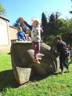Anschließend wurden die verschiedenen Skulptur- Steine ausprobiert. Sogar die Kleinen trauten sich auf die hohen und steilen Steine zu klettern und, mit einer kleinen Unterstützung einer Erzieherin, herunterzuspringen oder wieder herunterzuklettern. Die Kinder rannten hin und her und eroberten einen Stein nach dem anderen. Stolz, dass sie es hochgeschafft haben, winkten sie von oben herunter.