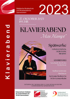 Am Freitag, dem 27. Oktober 2023 gibt der Germersheimer Pianist Max Hampl, ehemals Schüler der Germersheimer Musikschule einen Klavierabend im Konzertsaal der Städtischen Musikschule Germersheim.