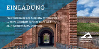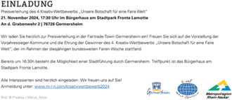 Die Stadt Germersheim und die Metropolregion Rhein-Neckar freuen sich, Sie zur diesjährigen Preisverleihung des Kreativ-Wettbewerbs „Unsere Botschaft für eine Faire Welt“ nach Germersheim einzuladen. Der Wettbewerb wurde dieses Jahr bereits zum vierten Mal von der Metropolregion Rhein-Neckar ausgerichtet und fördert Kreativität und Engagement für Nachhaltigkeit, soziale Gerechtigkeit und den Schutz der Umwelt. Steuerungskreise der Fairtrade-Towns, alle interessierten Kommunen sowie Vereine aus der Metropolregion Rhein-Neckar konnten sich mit Aktivitäten in ihrer Stadt oder ihrem Landkreis an dem Wettbewerb beteiligen und so ihre Faire Botschaft in den öffentlichen Raum bringen. Ob durch Kunstwerke, Veranstaltungen oder Mitmachaktionen für eine faire Welt, der Kreativität waren keine Grenzen gesetzt.