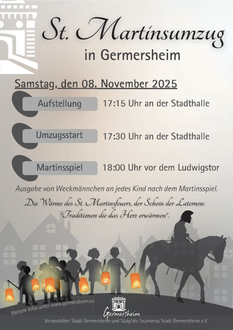 Am Samstag, dem 08. November 2025, findet der diesjährige Germersheimer St. Martinsumzug statt. Der traditionelle und schöne Laternenumzug mit anschließendem Martinsspiel ist bei allen Kindern unserer Stadt und ihren Familien sehr beliebt.