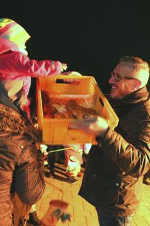 Musikalisch wurden sie hierbei durch den Musikverein 1959 Sondernheim e.V. mit den bekannten und zum Mitsingen animierenden Martinsliedern unterstützt. Zurückgekehrt an die Tulla-Schule fand das von der Theatergruppe Sondernheim unter der Leitung von Annabell Hellmann einstudierte Martinsspiel statt, nach dessen Ende das Martinsfeuer entzündet wurde. Kulturgemeindevorsitzender Ingo Schneider bedankte sich in einer kurzen Ansprache bei allen Teilnehmenden und Mitwirkenden und insbesondere beim Germersheimer Roßstall, der freiwilligen Feuerwehr Germersheim, sowie dem städtischen Betriebshof für deren Unterstützung sowie bei der Sparkasse Südpfalz für die finanzielle Beteiligung. Im Anschluss wurden alle Kinder Gemeinsam von Bürgermeister Schaile, Ortsvorsteher Rentschler und dem Kulturgemeindevorsitzendem Schneider mit einem Weckmännchen für ihre Teilnahme belohnt. Zum geselligen Verweilen lud darüber hinaus noch der Förder- und Freundeskreis der Tulla-Schule zu Bratwurst, Punsch und Glühwein ein.