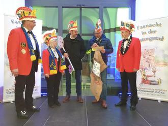 Der Erste Beigeordnete Dr. Sascha Hofmann musste den Stadtschlüssel und Bürgermeister Marcus Schaile das leere Stadtsäckel an die Elferratspräsidentin Birgit Abramovski und den Vereinsvorsitzenden Michael Butz abgeben. Allerdings war das Säckel in diesem Jahr nicht so leer wie es schien, denn alle freuten sich darüber, als Bürgermeister Schaile doch noch von ganz unten ein prall gefülltes Geldkuvert herauszog und den „Rhoischnooken“ übergab.