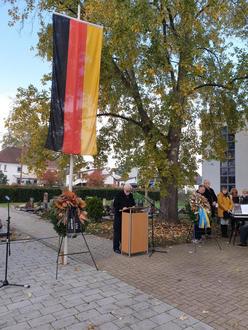Ortsvorsteher Friedrich Rentschler begrüßte zur diesjährigen Gedenkfeier zum Volkstrauertag alle Besucherinnen und Besucher auf dem Friedhof in Sondernheim.
