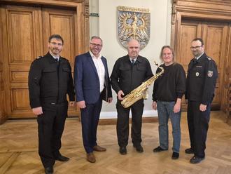 Freuten sich über die großzügige Saxophon-Spende des engagierten Feuerwehrmannes Arthur Steil an die Städtische Musikschule und Musikakademie Germersheim: Bürgermeister Marcus Schaile (2.v.l.), Musikschulleiter Bernhard Stephan (2.v.r.) sowie Wehrleiter Andreas Magin (ganz rechts im Bild) und sein Stellvertreter Till Mattes. Foto: HFalter | Stadt Germersheim