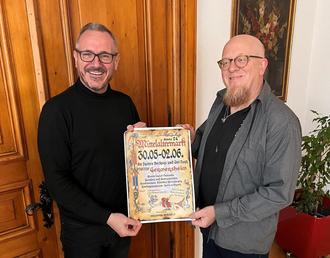 v.l.n.r. Das Foto zeigt Bürgermeister Marcus Schaile zusammen mit Carolan Lieb, dem Veranstalter des Mittelaltermarktes 2024 in Germersheim (Foto: Eva Wöhlert, Stadt Germersheim)