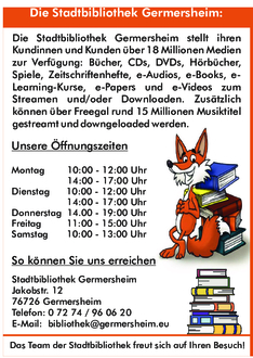 Bitte beachten Sie, dass die Stadtbibliothek vom 23.12.2023 bis 01.01.2024 geschlossen bleibt!