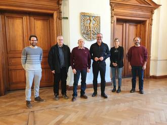 (v.l.n.r.) Benjamin Berger (Stellv. Abteilungsleiter Bauabteilung), Peter Weng (Leiter Betriebshof), Waldemar Malinowski, Bürgermeister Marcus Schaile, Büroleiterin Katrin Kunz, Christian Willy (Stellv. Personalratsvorsitzender). Foto: Stephanie Mohr I Stadt Germersheim