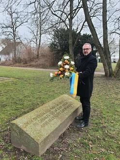 Zum Gedenken an die Holocaust-Opfer legte Bürgermeister Marcus Schaile am Freitag vergangener Woche ein Blumenbukett auf dem Gedenkstein vor dem Ehrenmal im Ludwigspark nieder.