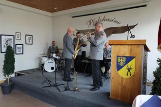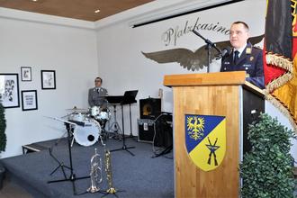 Beim diesjährigen Neujahrsempfang am 24. Januar 2024 in der Südpfalz-Kaserne in Germersheim konnte der Standortälteste und Kommandeur des Luftwaffenausbildungsbataillons, der gemeinsam mit dem Leiter des Sanitätsversorgungszentrums Germersheim, Oberfeldarzt Dr. Christian Safar zu dieser Veranstaltung eingeladen hatte, wieder zahlreiche Gäste aus Politik und Wirtschaft begrüßen. Allen voran galten die ersten Willkommensgrüße dem Mitglied des Deutschen Bundestages Dr. Thomas Gebhart sowie dem Bürgermeister der Garnisonsstadt Germersheim, Marcus Schaile. Des Weiteren hieß Kück die Vertreter der Wirtschaft, der Blaulichtorganisationen, und der Patengemeinden besonders willkommen. Für die Militärs galt sein Willkommensgruß dem Kommandeur des ABC-Abwehrbataillons 750 „Baden“ aus Bruchsal sowie zwei ehemaligen Kommandeuren des Verbandes. Zur musikalischen Untermalung der Veranstaltung konnte Oberstleutnant Kück das Jazzensemble des Heeresmusikkorps Koblenz unter der Leitung von Stabsfeldwebel Michael Peter begrüßen.