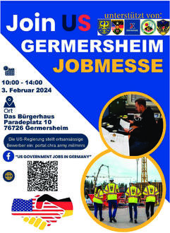 Die U.S. Army Garrison Rheinland-Pfalz bietet am 3. Februar 2024 eine Jobmesse in Germersheim an. Diese findet statt von 10 bis 14 Uhr im Bürgerhaus, Paradeplatz 10.