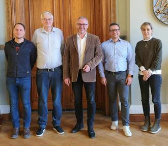 Germersheims Bürgermeister Marcus Schaile (Bildmitte), Büroleiterin Katrin Kunz, Marco Eßwein, Abteilungsleiter der Finanzverwaltung (2.v.r.), sowie Andreas Kern, stellvertretender Personalratsvorsitzender (ganz links), wünschten dem scheidenden Stadtamtmann Werner Nelles alles Gute für seinen bevorstehenden Ruhestand. Foto: SMohr | Stadt Germersheim