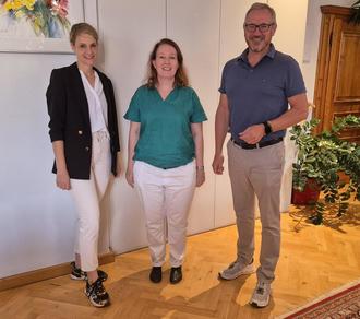 Anfang September hat Caroline Hilsendegen (Bildmitte), die die Nachfolge von Werner Nelles antritt, ihre Arbeit in der städtischen Liegenschaftsabteilung aufgenommen und wurde von Bürgermeister Marcus Schaile und Katharina Keller, der stellvertretenden Abteilungsleiterin der Finanzverwaltung, herzlich begrüßt. Foto: HFalter | Stadt Germersheim