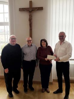 Der Germersheimer Mittagstisch „Gemeinsam statt allein“ finanziert sich über Spenden. Die Freude bei den Verantwortlichen war also nachvollziehbar groß, als Germersheims Bürgermeister Marcus Schaile (ganz rechts im Bild) am Mittwoch letzter Woche Sozialreferentin Rita Rösch im Beisein von Dekan Jörg Rubeck (ganz links) und von Ekkehard Leicht, einem, wie er selbst sagt, „Mitglied der Küchenbrigade“, die Spende des städtischen Neujahrsempfangs 2026 überreichte. Foto: SNelles | Stadt Germersheim