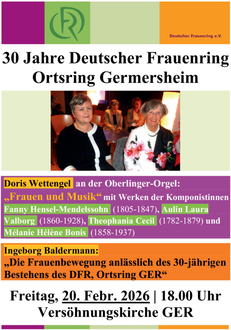 Der Ortsring Germersheim des Deutschen Frauenrings begeht sein 30-jähriges Bestehen. Aus diesem Anlass findet am Freitag, 20. Februar, um 18:00 Uhr in der Versöhnungskirche eine Jubiläumsveranstaltung statt. Vorsitzende Ingeborg Baldermann referiert zum Thema „Die Frauenbewegung anlässlich des 30-jährigen Bestehens des Deutschen Frauenrings, Ortsring Germersheim“, während Doris Wettengel an der Oberlinger-Orgel Werke von Organistinnen vorstellt, die zu Lebzeiten ignoriert wurden, erst von der Kirche, später von Vätern, Ehemännern, Verlegern, Konzertveranstaltern und Musikhistorikern. Erklingen werden Werke von Fanny Hensel-Mendelsohn, Aulin Laura Valborg, Theophania Cecil, Melanie Helene Bonis und Rosalie Bonighton. Der Eintritt ist frei.