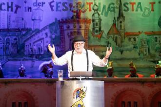 Die politische Büttenrede von Peter Horn unterstrich das diesjährige Motto der Rhoischnooke „Die Narrenschar, die wünscht sich sehr, das Frieden auf der Erde wär“.