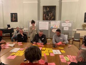 Die Teilnehmenden wurden beim Workshop in zwei Gruppen aufgeteilt. Nachdem zunächst Verständigungsfragen geklärt wurden, in dem die erste Gruppe die Aussagen über das Selbstverständnis, den Auftrag und die Vision bearbeitete, sollte die zweite Gruppe genau diese Ideen kritisch hinterfragen. Diese wurde aufgefordert, das „Haar in der Suppe“ zu suchen und vielfältige Faktoren wie etwa Finanzierung oder Kostendeckung näher zu beleuchten.