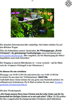 Über die Schaukästen unserer Gemeinden, die Whatsappgruppe „Kirche Ulrichstein“, die gleichnamige Facebookgruppe sowie im Internet unter www.kirche-ulrichstein.de. über Angebote, die bei Drucklegung des Mitteilungsblattes noch nicht feststehen!