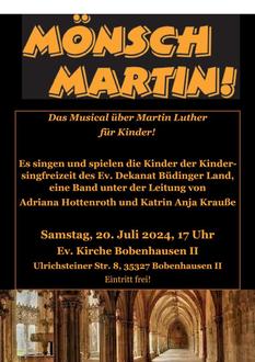 | Ein Mönch verändert die Welt - In dem mitreißendem Musical „Mönsch Martin“ aus der Feder der Kantoren Ulrich Meier, Enrico Langer und Matthias Grummet wird die Geschichte des Menschen und Mönchen Martin Luther erzählt. |