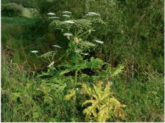 Große, gezackte Blätter, weiße Blütendolden, die über einen halben Meter Durchmesser erreichen können - alles an der Pflanze ist riesenhaft. Es geht um die Herkulesstaude, die auch Riesen-Bärenklau genannt wird. Bekannt wurde die imposante Staude, weil sie einen Stoff enthält, der in Kombination mit Sonnenlicht zu schweren Verbrennungen führen kann - einschließlich großer Brandblasen. Riesen-Bärenklau ist eine eingeschleppte Pflanze, ein sogenannter Neophyth. Er wächst vor allem an ungenutzten Stellen, wie Wegböschungen, Heckenränder und Ufer von Gewässern. Immer im Juni / Juli kommen die Pflanzen zur Blüte und werden dann auffällig. Ohne Bekämpfung produziert jede Pflanze dann mehrere tausend Samen, aus denen schnell Massenbestände entstehen, die kaum noch in den Griff zu bekommen sind. Solche Massenbestände gab es auch in der Großgemeinde Ulrichstein an verschiedenen Orten. Inzwischen werden aber nur noch Einzelpflanzen gefunden. Die Suche nach verbliebenen Einzelpflanzen ist sehr aufwändig ist. Ein Grund ist, dass Samen in Bächen und Flüssen verschwemmt werden und irgendwo unterhalb am Ufer keimen und wachsen können. Alle bisher bekannten Standorte und große Abschnitte der Gewässer wurden deshalb auch dieses Jahr kontrolliert. Aber es können natürlich Pflanzen übersehen worden sein. Jetzt sind wir auf die Unterstützung der Bürgerinnen und Bürger angewiesen, die vielleicht noch Einzelpflanzen entdecken