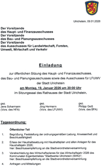 | 3. | Verabschiedung des Wirtschaftsplanes für das Wirtschaftsjahr 2026 des Kommunalen Eigenbetriebes "Stadtwerke Ulrichstein (SWU)"; | |