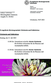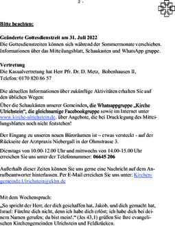 Über die Schaukästen unserer Gemeinden, die Whatsappgruppe „Kirche Ulrichstein“, die gleichnamige Facebookgruppe sowie im Internet unter www.kirche-ulrichstein.de. über Angebote, die bei Drucklegung des Mitteilungsblattes noch nicht feststehen!