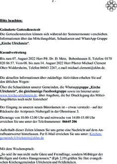 Bis zum 07. August 2022 Herr Pfr. Dr. D. Metz, Bobenhausen II, Telefon: 0170 820 86 57. Vom 08. bis zum 14. August 2022 Herr Pfarrer Michael Clement Ober-Widdersheim, Telefon 06043 2267, e.mail michael.clement@ekhn.de.