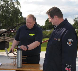 Bisher wurden 400 Kubikmeter Erde bewegt, 60 Tonnen Schotter verteilt und verdichtet, 3,5 Tonnen Bewehrungsstahl gebunden, 120 Quadratmeter Dämmung eingebaut, 40 Meter Fundamenterder verlegt, 32 Kubikmeter Beton als Ortbeton mit der mobilen Mischanlage selbst gemischt und 20 Kubikmeter Lieferbeton mit der Pumpe eingebaut. Wehrführer Jost bezifferte die bisherige Eigenleistung in den letzten 10 Wochen mit 750 Stunden. Er dankte allen Helferinnen und Helfer die das Projekt unterstützen und auch Arbeiter mit Frühstück und Mittagessen versorgen: „Ob Jugendliche oder Kameraden der Alters- und Ehrenabteilung, alle zeigen Interesse stehen mit Rat und Tat zur Seite und unterstützen das Bauvorhaben“.
