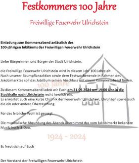 Einladung zum Kommersabend anlässlich des 100-jährigen Jubiläums der Freiwilligen Feuerwehr Ulrichstein