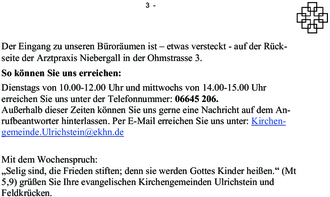 Außerhalb dieser Zeiten können Sie uns gerne eine Nachricht auf dem Anrufbeantworter hinterlassen. Per E-Mail erreichen Sie uns unter: Kirchengemeinde.Ulrichstein@ekhn.de
