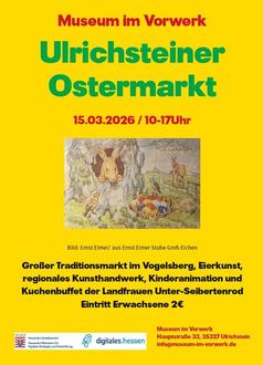 2026 fängt im Museum im Vorwerk in Ulrichstein mit dem beliebten und größten Indoor Kunsthandwerker Markt im Vogelsberg an. Am 15.3.2026 öffnet das Museum ab 10 Uhr für Besucher die Türen und zeigt wieder Kunsthandwerk wie Eierkunst, Schmuck, Osterfest Deco, Filz und Wollarbeiten sowie Holzarbeiten und Seife und viele andere schöne Sachen, die wunderbar zum Verschenken und Freude machen taugen. Aber auch regionale Produkte werden wieder angeboten und laden zum schlemmen ein, Käse, Wurst, Honig, Marmeladen und Prosecco sind nur einige der Leckereien natürlich sind auch die Landfrauen mit unglaublichen Torten und Kuchen am Start. Für Kinder bietet das Museumsteam wieder basteln und Märchen vom Moosweibchen an welche nicht nur bei Kindern zum Herbstmarkt der Renner waren.