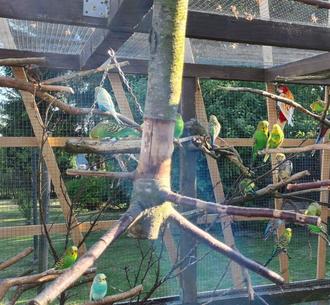 Nach langen Bürotagen stehe ich an/in meiner schönen Sommer/Wintervolliere und schaue dem regen Treiben darin zu.