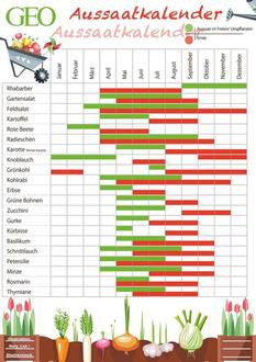 Doch was sollte man wann anpflanzen? Bei der Fülle an Sorten verlieren besonders Anfänger schnell den Überblick. Dabei ist die richtige Gartenplanung das A und O. Unser Aussaatkalender hilft Ihnen dabei, Ihr persönliches Gartenjahr zu planen. Jeden Monat liefert der übersichtliche Pflanzkalender Informationen zum richtigen Zeitpunkt für die Aussaat im Freien (grün) und die Ernte (rot) der wichtigsten Gemüse, Salate und Kräuter.
